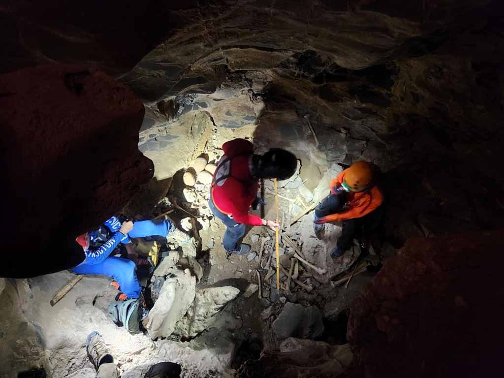 Por un tiro vertical, de solo 50 centímetros de ancho, llegaron a un primer nivel, a cuatro metros; ahí, en el umbral de la penumbra, tras cruzar una grieta se abrió una sala donde, a través de otro tiro vertical continuaron el descenso, ocho metros más abajo, hasta llegar a donde se encontraron los restos óseos: una pequeña cámara semicircular donde yacían fragmentos de textiles, característicos de las culturas del desierto, revueltos con huesos humanos.