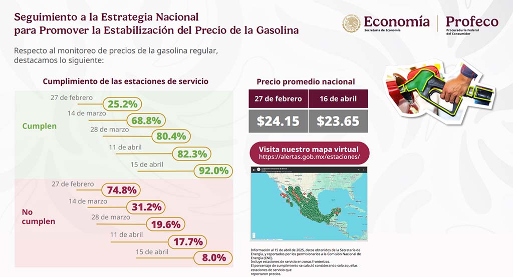 Iván Escalante, titular de la Procuraduría Federal del Consumidor (Profeco), informó que al 16 de abril, un 92% de las estaciones de servicio ya se han sumado a la Estrategia por lo que venden el litro de gasolina regular en menos de 24 pesos.