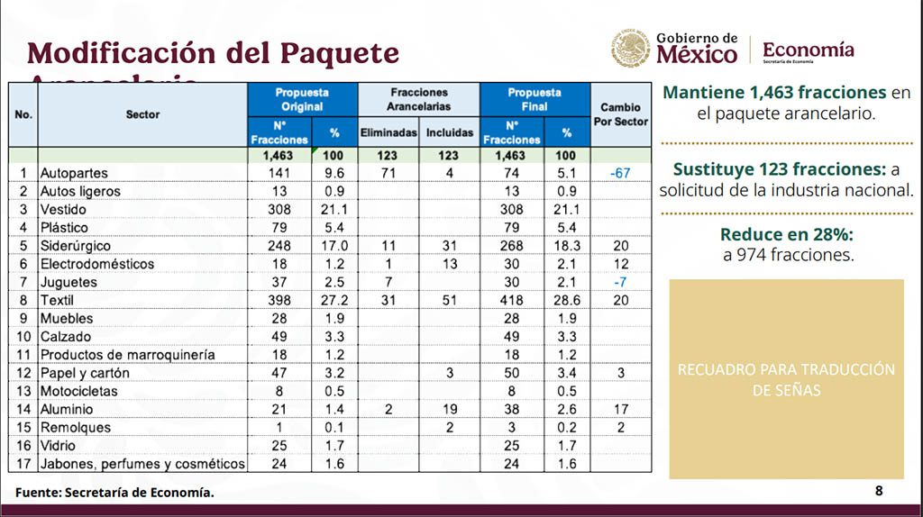 El funcionario añadió que la Cámara de Diputados y la Secretaría de Economía sostuvieron reuniones con las asociaciones y cámaras representantes de estos 17 sectores quedando las fracciones arancelarias que se muestran en la tabla:
