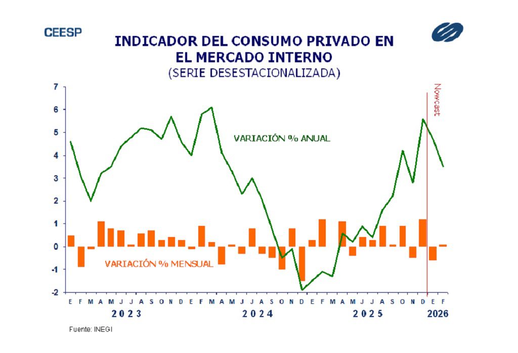 De acuerdo con la estimación oportuna del INEGI, durante enero pasado el indicador de consumo privado reportó una disminución de 0.6%, resultado que contrasta con la estimación previa que anticipaba un avance de 0.1%. Con este comportamiento, su comparación anual se ubicó en 4.7%, aunque esta fue menor al aumento de 5.6% reportado un mes antes, que fue su mayor avance desde marzo del 2024. Para febrero el INEGI considera que el consumo privado aumentó 0.1%, aunque este resultado parece anticipar un menor dinamismo del consumo para los siguientes meses. Con este modesto avance mensual, en su comparación anual el consumo privado se ubica en 3.5%, que es el menor incremento de los últimos tres meses.