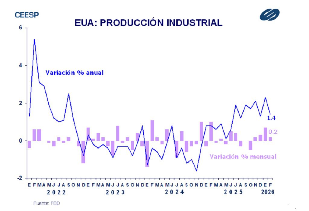 La Reserva Federal informó que en febrero la producción industrial aumentó 0.2%, después de un avance de 0.7% un mes antes e inferior al pronóstico del mercado que anticipaba un incremento de 0.4%. El mayor dinamismo se observó en la minería que reportó un crecimiento de 0.9% en febrero, después de que un mes antes creciera 0.8%. La actividad manufacturera moderó su comportamiento al reportar un avance de 0.2%, después de que el mes previo mostrara un avance de 0.8%. Por su parte, la producción de servicios públicos disminuyó 0.6% tras un incremento de 0.1% en enero. En su comparación anual la producción industrial aumentó 1.4%, aunque esto implicó un menor dinamismo al comparase con un mes antes cuando creció a una tasa anual de 2.3%, que fue su mayor crecimiento desde septiembre del 2022.
