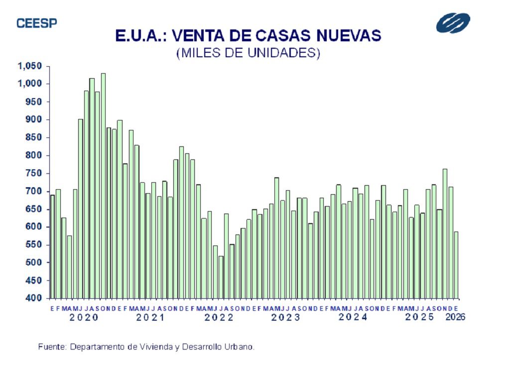 El reporte del Departamento de Vivienda y Desarrollo Urbano señaló que, con base en cifras ajustadas a tasa anual, durante enero se vendieron 587 mil viviendas nuevas, cifra que resultó notoriamente inferior a la estimación del mercado que anticipaba la venta de 719 mil viviendas. Esto significó una caída 17.6% respecto al mes previo y un baja de 11.3% si se compara con el mismo mes del año pasado. En enero el precio promedio de la vivienda se ubicó en 499,500 dólares, 3.6% menor al precio de enero del año pasado.