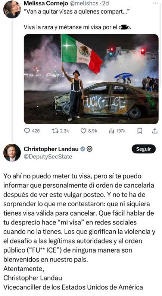 Landau respondió así a una publicación de Cornejo, quien de forma soez expresó su inconformidad por la cancelación de visas por parte del Gobierno de EUA a quienes difundieran en redes sociales u otros medios, contenido a favor de las protestas de migrantes que han ocurrido en los últimos días en la ciudad de Los Ángeles.